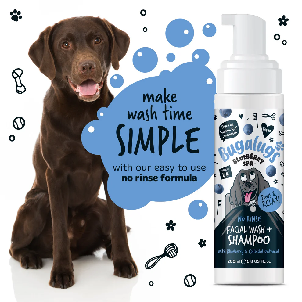 Verwen je hond met een vleugje luxe met de Bugalugs Blueberry Spa No-Rinse Facial Wash & Shampoo – een zachte, waterloze reiniging speciaal ontwikkeld voor het meest gevoelige deel: het gezicht. Deze milde, schuimende formule verwijdert voorzichtig vuil, tranenstrepen en onzuiverheden, terwijl de vacht fris, schoon en glanzend blijft. Dankzij de no-rinse formule is het ook een handige shampoo voor het hele lichaam – ideaal voor een snelle opfrisbeurt tussen badmomenten door.