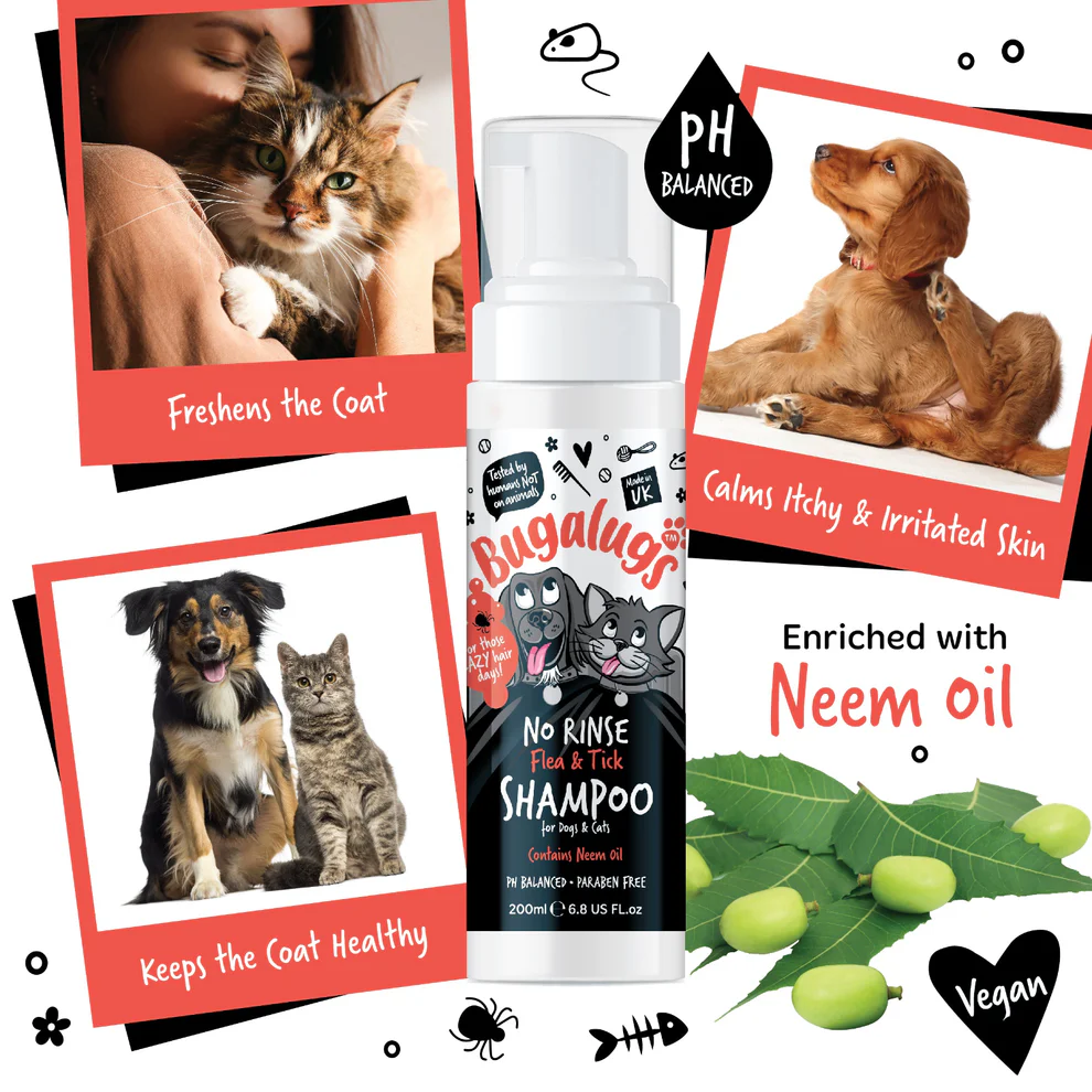 Zeg vaarwel tegen vervelende vlooien en teken met Bugalugs Vlooien & Teken No-Rinse! Deze innovatieve shampoo zonder uitspoelen is verrijkt met neemolie en is veilig én effectief voor honden. De milde formule helpt niet alleen bij het bestrijden van vlooien en teken, maar verzorgt ook de vacht, kalmeert de huid en verzacht irritaties.